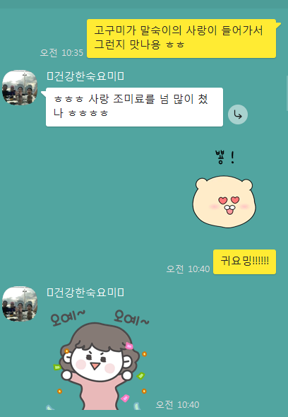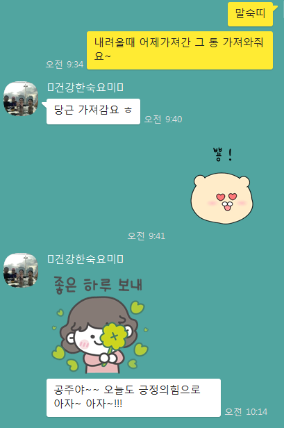 이 카톡만 보면 애교쟁이 미성년자 딸과 카톡같지만 나는 20대 후반이고 엄마께서는 곧 60세이시다...;; 엄마가 이렇게 귀여울 일인감...우리는 서로를 무척이나 귀여워한다... 아빠는 카톡을 잘안하고 주로 전화만 해서 남겨둘순 없지만 엄마의 애정가득 카톡은 자주자주 기록해야지 나중에 힘든일 있을때 읽을수 있도록..