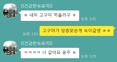나의 사랑하는 엄마랑 가끔 카톡할때 진짜 귀여운 모먼트가 많지만 지금 생각나는건만 캡쳐를 하면 고구마만 삶아 먹어두 말을 이쁘게 해드리면 더 귀여운 답변이 따라온다 ㅎ...ㅎ 엄마랑 싸울땐 세상 모진딸이지만 사이좋을땐 룰루랄라다...사람사는거 다그런거겠죠?